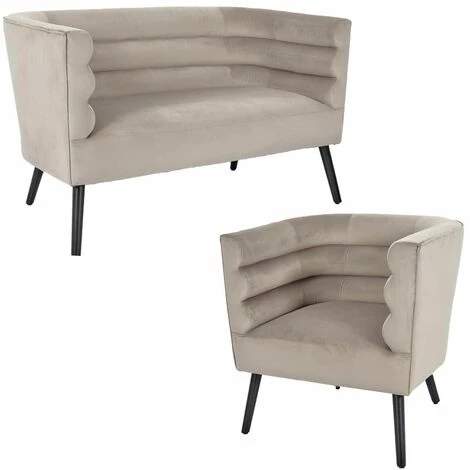 Fauteuil et Canapé : Piétement métallique coloris noir. Coque en MDF, revêtues de tissu 100% polyester coloris Taupe garnis de mousse.