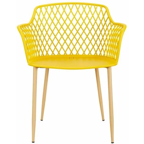 Piétement en fer, finition aspect bois verni. Assise et dossier en polypropylène.