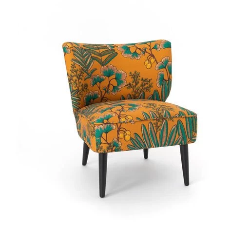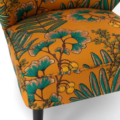 Ce joli fauteuil de la gamme Victoria va vous séduire ! Son assise large et épaisse offre un confort optimal tandis que son tissu confectionné en France apportera de l’originalité à votre intérieur. Son motif végétal teinté de vert est rehaussé par l’ocre jaune qui ajoute de la chaleur à l’ensemble.