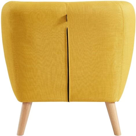 Fauteuil au style scandinave avec sa structure en bois massif et son revêtement en tissu jaune.