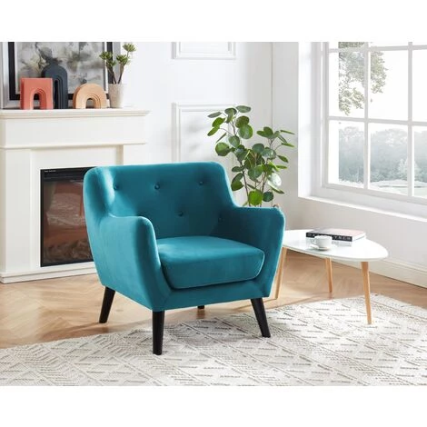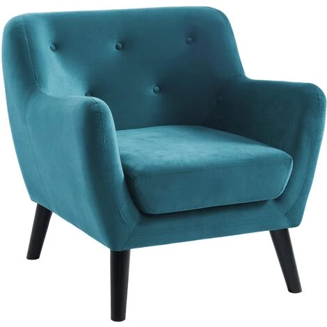 Fauteuil au style scandinave avec sa structure en bois massif et son revêtement en velours bleu/gris.