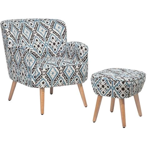Fauteuil avec un repose-pieds motifs orientaux. Cette chaise rembourrée charmante et gaie, accompagné de son repose-pieds, deviendra immédiatement votre nouvel endroit préféré ! Ses motifs orientaux décoratifs de couleur noire et bleue sur un fond clair répand une atmosphère confortable qui vous promet un endroit de détente idéal. Son design avec une touche rétro s’intègre à tous les styles de design d’intérieur – même dans un intérieur à la décoration classique. Le fauteuil est agréablement rembourré avec des accoudoirs confortables et incurvés, les pieds minces et robustes en bois d’hévéa de ton naturelle marron. Le revêtement en tissu polyester est très résistant est particulièrement facile à nettoyer. Le point d’orgue c’est son repose-pieds dans la même conception, ce qui vous permettra d’avoir encore plus de confort !Un fauteuil décontracté avec beaucoup d’élégance !