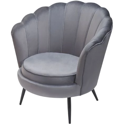 Fauteuil coquillage glamour et rétro tapissé en velours gris. Un choix parfait pour tous ceux et celles qui cherchent à apporter une touche rétro et glamour à leur intérieur. Ce magnifique fauteuil coquillage, élégamment tapissé en velours gris de qualité, est un véritable petit bijou déco capable de rafraîchir instantanément le look de chaque chambre ou salon. Son rembourrage épais, ses coutures décoratives et ses pieds obliques tendance en métal noir, font de ce superbe fauteuil design un meuble à la fois très confortable et durable. C’est inévitable, vous allez tout simplement l’adorer !