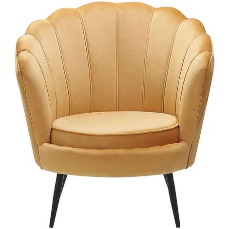 Fauteuil coquillage glamour et rétro tapissé en velours jaune. Un choix parfait pour tous ceux et celles qui cherchent à apporter une touche rétro et glamour à leur intérieur. Ce magnifique fauteuil coquillage, élégamment tapissé en velours jaune de qualité, est un véritable petit bijou déco capable de rafraîchir instantanément le look de chaque chambre ou salon. Son rembourrage épais, ses coutures décoratives et ses pieds obliques tendance en métal noir font de ce superbe fauteuil design un meuble à la fois très confortable et durable. C’est inévitable, vous allez tout simplement l’adorer !