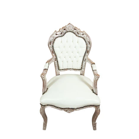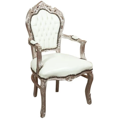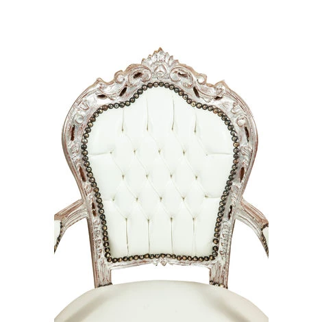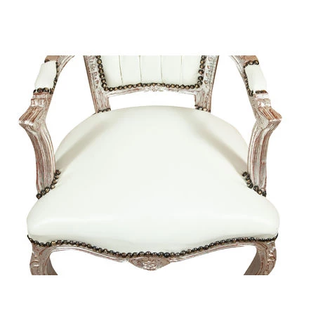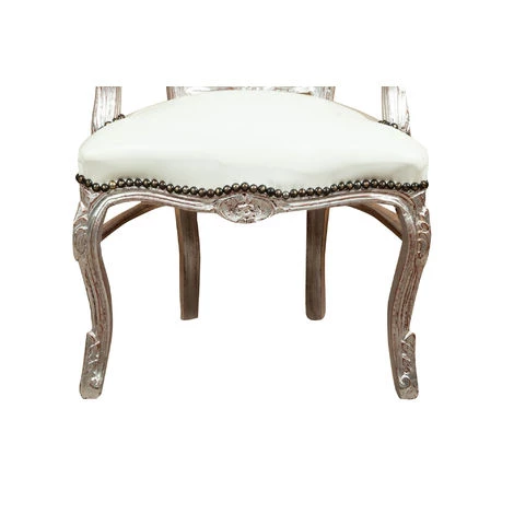 | Fauteuil style Français Louis XVI, en hêtre massif. Sculpté et fini à la main avec patine en feuille argent de taille longueur 60 cm, profondeur 60 cm, hauteur 107 cm. Assise et dossier rembourrés. |