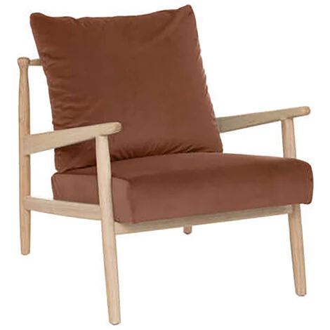 Fauteuil en velours coloris terracotta. Facile à installer. Assise confortable et épais. Dimensions: Longueur 65 x Profondeur 78 x Hauteur 82 cmHauteur assise : 43 cm Matière: contreplaqué / fer / hévéaCouleur: terracotta Poids : 10 Kg
