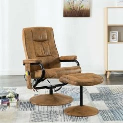 Détendez-vous dans ce fauteuil de massage réglable, en similicuir daim de qualité avec repose-pied. Il offre des notes de luxe et de glamour qui seront le choix idéal pour vous détendre dans votre salon. Ce fauteuil de massage en similicuir daim, doté d’un repose-pied, allie style et fonctionnalité. L’ensemble dispose d’un cadre en métal et en bois, rempli de mousse haute densité et recouvert de similicuir de qualité pour un confort maximum. Le siège épais et le dossier moelleux sont très confortables. De plus, lorsque le dossier est incliné, vous pouvez poser vos pieds sur notre confortable repose-pied. Avec un massage en 8 points, un dossier chauffant et une télécommande incluse, vous pouvez rapidement oublier le stress de la vie quotidienne. Ce luxueux fauteuil pivotant est le meilleur choix pour un bureau à domicile ou une salle d’étude. Faites l’expérience d’un confort d’assise optimal sur cet ensemble confortable de fauteuil inclinable et de repose-pied !