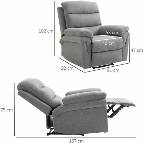 Ce fauteuil de relaxation inclinable avec repose-pied ajustable en tissu vous offrira une expérience unique de détente et de bien-être confortablement installé. Vous pourrez incliner son dossier et relever son repose-pieds à votre guise en tirant sur la poignée prévue à cet effet et en exerçant une pression arrière. Caractéristiques : – Fauteuil de relaxation inclinable style contemporain épuré coloris gris clair chiné pour une parfaite intégration à votre intérieur – Équipé d’un dossier inclinable (jusqu’à 165°) et d’un repose-pieds relevable manuellement en tirant sur la poignée prévue à cet effet et en exerçant une pression arrière – Assise dotée d’un épais garnissage mousse haute densité 24 Kg/m³ tout comme le dossier (20 Kg/m³) – Revêtement en tissu polyester aspect lin haute densité 280 g/m² très perméable à l’air et donc très agréable au toucher par n’importe quelle condition : chaleur ou fraicheur – Grande fléxibilité et souplesse grâce au système de ressort sous-jacent – Accoudoirs et haut dossier ergonomique pour un confort d’installation optimal – Montage facile, rapide à l’aide du manuel d’assemblage illustré fourni Spécifications : – Couleur : gris clair chiné – Matériaux principaux : polyester aspect lin, garnissage mousse, MDF, acier – Dim. position assis : 91L x 92l x 102H cm – Dim. position inclinée : 91L x 167l x 75H cm – Dim. assise : 49L x 53l x 47H cm – Dim. dossier : 70L x 66H cm – Dim. accoudoirs : 26L x 60H cm – Charge max. recomandée : 120 Kg – Livraison effectuée en un colis – Réf. : 839-255GY