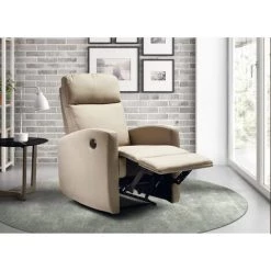 Le fauteuil de relaxation manuel proposé avec un revêtement en tissu de couleur beige de la collection Kali s’intégrera parfaitement à votre intérieur. Son mécanisme manuel supporte un poids de 120 kg. Couleur : beigeRevêtement : toile 100% polyesterArmature : bois massif avec des équerres renforcées.Suspension de l’assise : ressorts métalliques zig-zag entrelacées.Suspension du dossier : sangles de haute résistance.Assise : mousse polyuréthane de densité 28 kg/m3Dossier : fibres creuses vierges siliconéesAccoudoirs : mousse polyuréthane de densité 28 kg/m3.Mécanisme de relax manuel. Ouverture grâce à un levier latéral.3 positions du fauteuil pour commodité de l’usuraire.Résistance maximum 120 kg.Dimensions du fauteuil fermé (Lxlxh) : 67 x 80 x 105 cmDimensions du fauteuil ouvert (Lxlxh) : 67 x 147 x 90 cmFauteuil 1 mécanisme relax manuel.Poids : 27 kgGarantie 5 ans – Fabrication EspagneCe produit est livré montéNous ne livrons pas en Corse.