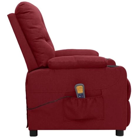 Installez-vous confortablement dans ce fauteuil releveur inclinable de massage très confortable, recouvert de tissu de qualité ! Fonction de massage : les 6 points de massage inclus vous permettent de profiter d’un massage mieux ciblé. Fonction d’inclinaison électrique : découvrez la position la plus confortable tout en vous relaxant dans le fauteuil inclinable. La télécommande incluse vous permet d’ajuster le dossier et le repose-pied en fonction de votre confort.Fonction de levage : ce releveur fauteuil inclinable est équipé d’un moteur électrique pour la fonction de levage. Grâce à la fonction debout qui pousse toute la chaise vers le haut, vous pouvez facilement vous tenir debout sans stresser votre dos et vos genoux.Matériau haut de gamme : le tissu est exceptionnellement confortable et doux au toucher. Il est également durable, avec un look simple et propre. Le fauteuil inclinable est bien rembourré pour un confort optimal.Cadre robuste et stable : le cadre en bois et en métal assure robustesse et stabilité.Couleur : rouge bordeauxMatériau : tissu (100 % polyester), métalDimensions totales : 78,5 x 93 x 96,5 cm (l x P x H)Dimensions de couchage : 78,5 x 136,5 x 80,5 cm (l x P x H)Dimensions du siège : 53 x 51 cm (l x P)Hauteur du siège à partir du sol : 45,5 cmHauteur des accoudoirs à partir du sol : 59,5 cmEntrée : c.c. 28 V, 1,5 AOptions : massageType de massage : massage par vibrations par 6 pointsDossier et repose-pied réglablesAvec un moteur électrique pour la fonction de levageL’assemblage est requisLa livraison contient :1 x fauteuil releveur inclinable de massage 1 x adaptateur pour la fonction de levage1 x interface USB pour la fonction de massage (adaptateur 5V n’est pas inclus)1 x commande manuelle pour la fonction de levage1 x commande manuelle pour la fonction de massageNous ne livrons pas en Corse.