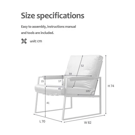 Robuste et durable : le fauteuil est fabrique en acier avec un revetement en poudre qui a un effet antirouille pour une utilisation durable. Plus comme une chaise de style Barcelone, confortable et tres solide.