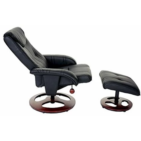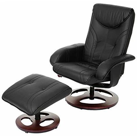Fauteuil de relaxation Oxford, fauteuil de télévision avec tabouret, similicuir ~ noir- livraison: fauteuil avec tabouret- accoudoirs rembourrés- enveloppe en similicuir (100% polyuréthane)- tournable de 360°- pied en bois empilé collé- fauteuil inclinable par déplacement du poidsdimensions du fauteuil (env.):hauteur: 105 cmlargeur: 77 cmprofondeur: 68 cmhauteur d’assise: 45 cmprofondeur d’assise: 49 cmlargeur d’assise: 51 cmsurface: 123 cmhauteur du dossier (à partir du siège): 66 cmhauteur des accoudoirs (à partir du sol) 56 cm diamètre pied: 56 cmdimensions tabouret (env.):hauteur: 30 – 40 cmlargeur: 50 cmprofondeur: 45 cmdiamètre pied: 38 cmNos fauteuils de télévision sont tous différents, mais ils ont quand-même un point commun: Le mélange de design, fonctionalité et confort.Grâce à son design moderne, ce fauteuil a l’air énormément élancé et s’adapte parfaitement à tout ameublement.La surface inclinable par le déplacement du poids qui est également tournable de 360° vous garantit un repos en toute situation de vie.Indication: Notre similicuir consiste en polyuréthane à 100%, un matériau haut de gamme qui laisse la peau confortable. Par rapport au similicuir, le PVC serait une alternative moins cher, par contre, le PVC ne présente pas la même qualité et le même confort que le polyuréthane. Investissez dans la durabilité – vous ne le regretterez pas!