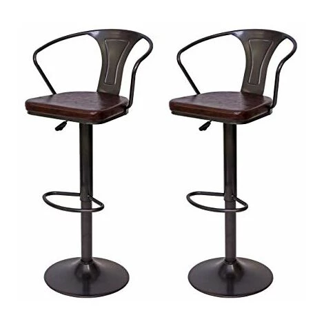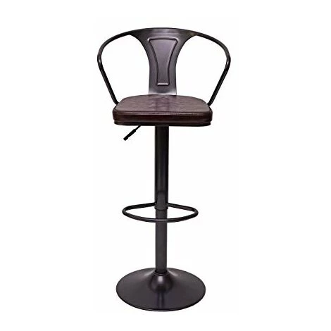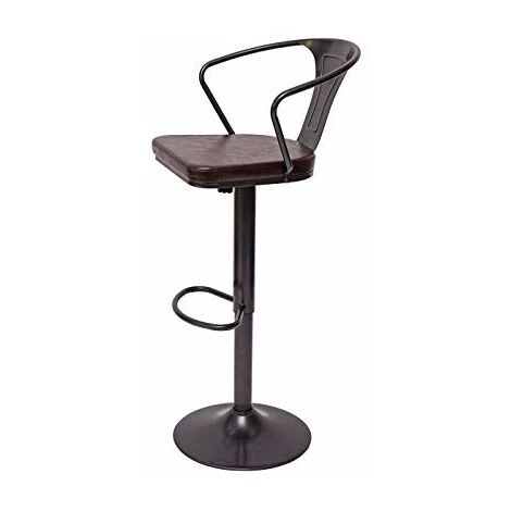 2x Tabouret de bar HWC-H10b, réglable en hauteur, avec accoudoirs, pivotant, design industriel ~ vintage noir-marron- Réglable en hauteur en continu- Pivotant de 360°- Charge maximale : 130 kg- Avec accoudoirs- Look vintage- Avec repose-pied stable- Montage facileCes tabourets du style industriel savent persuader par leur design marquant et le joli revêtement en look vintage. La combinaison des matériaux similicuir et acier arrondit leur apparence. Grâce au vérin à gaz qui se laisse facilement régler en hauteur en continu et la possibilité de pivoter de 360° ces tabourets sont à la fois pratiques et polyvalents. Chic et confortable à la fois : le dossier confortable qui est voûté légèrement vers l’arrière et le repose-pied stable vous permettent à vous asseoir confortablement et rester assis pendant longtemps. Dimensions (env.) :Hauteur : 88-108 cmLargeur : 51 cmProfondeur : 45 cmHauteur de l’assise : 63-83 cmLargeur de l’assise : 36 cmProfondeur de l’assise : 37 cmHauteur du dossier (à partir de l’assise) : 30 cmHauteur des accoudoirs (à partir de l’assise) : 23 cmÉpaisseur du rembourrage : 3 cmDiamètre du pied à disque: 40 cm Matériaux : Revêtement : 100 % PolyuréthaneCadre : acier thermolaqué Dans les années passées l’on ne voyait les tabourets que dans les bars, mais de nos jours ils sont à la mode et on les retrouve de plus en plus dans les domiciles privés. Étant polyvalent dans l’utilisation vous pouvez les utiliser non seulement comme tabourets de bar mais aussi comme chaises pour la salle à manger ou comme sièges flexibles (p.ex. pour des musiciens).Le tabouret se laisse manier facilement en hauteur grâce au vérin à gaz. Le repose-pied stable rend le confort d’assise parfait pour que vous pouvez rester assis pendant longtemps. Ce tabouret très chic avec son style industriel attirera les