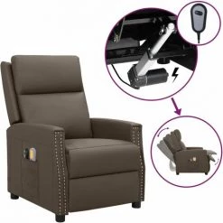 Asseyez-vous et détendez-vous dans ce fauteuil inclinable de massage électrique très confortable ! Fonction d’inclinaison : ce fauteuil inclinable est équipé d’un moteur électrique, qui vous permet de régler facilement le dossier et le repose-pied vers l’avant ou l’arrière à l’aide d’une simple commande.Matériau durable : le similicuir de qualité supérieure est un matériau très durable. Il est résistant aux taches, ce qui le rend facile à nettoyer avec un chiffon humide. La surface lisse donne également un aspect luxueux et la beauté du cuir véritable.Fonction de massage : les 6 points de massage inclus vous permettent de profiter d’un massage mieux ciblé.Cadre robuste et stable : le cadre en métal assure robustesse et stabilité. Remarque :Chaque produit est livré avec un manuel de montage dans la boîte pour un montage facile.
