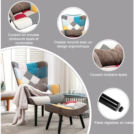 Ce fauteuil relaxant au style SCANDINAVE rétro en tissu patchwork crée une ambiance détendue et pacifique à la maison. De plus, en tenant compte d’un confort maximal, il est équipé d’un pouf correspondant à la hauteur faisant confortable du corps humain.